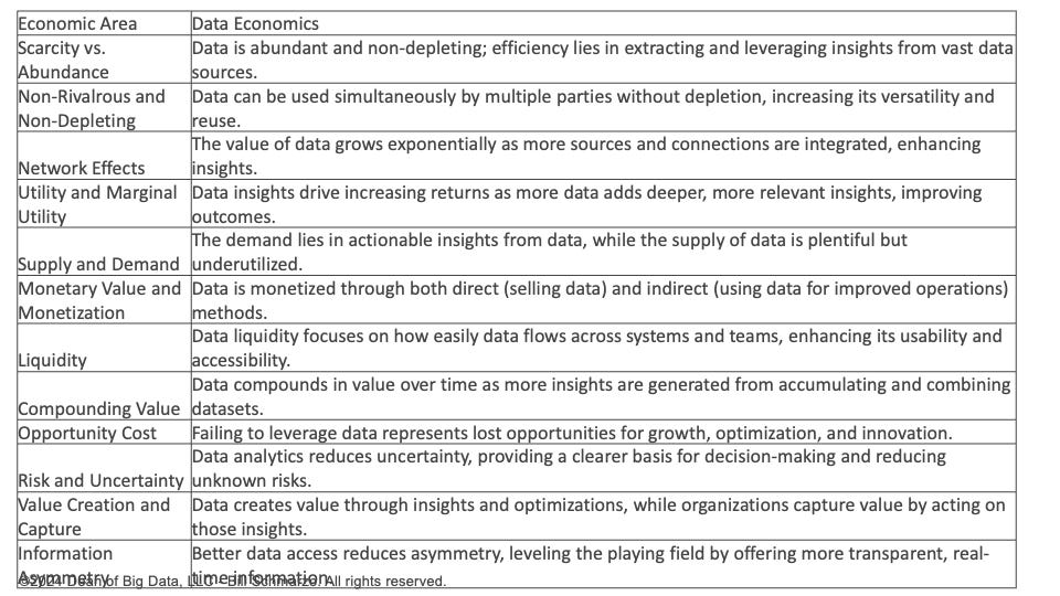 Data Economics: Data-driven economics emphasizes using abundant, non-depleting data to compound value through deeper customer, product, service, operational, and societal insights, insights-fueled innovation, and optimized operational processes and business models.