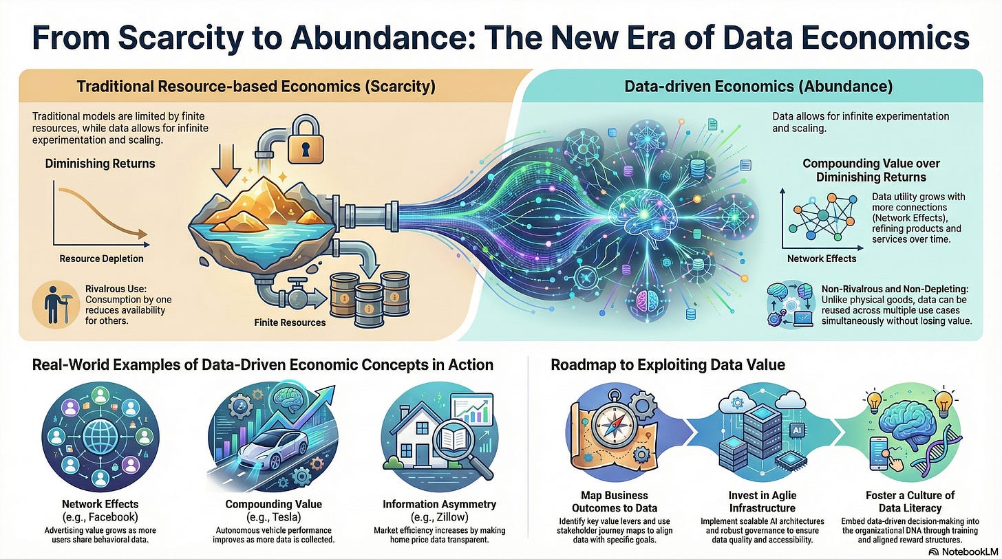The game has certainly changed with the data era, and maybe the most drastic change driven by data has occurred in economics, the foundation upon which our modern society is built and sustained. Understanding and mastering the transition from “traditional” economics to modern data-driven economics has become necessary for survival and growth. Unlike traditional economic principles that focus on scarcity, rivalry, and finite resources, data economics introduces a new landscape where data is abundant, non-depleting, and capable of generating compounding value when harnessed effectively.