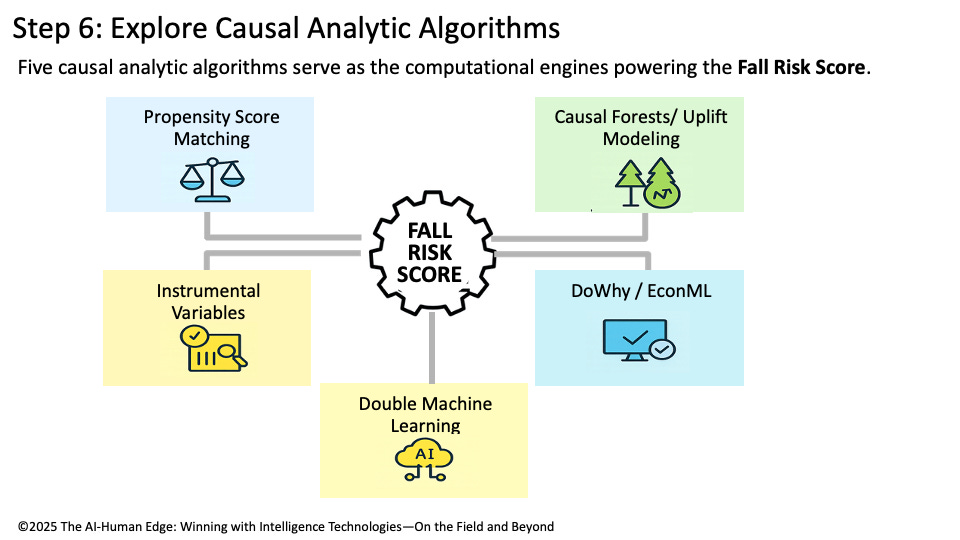 Causal analytic algorithms power the Fall Risk Score’s engine. PSM ensures fair comparisons, causal forests personalize interventions, IV disentangles complex variables, and frameworks like DoWhy/EconML bring it all together into scalable, testable models. This step transforms causal design into computational power, enabling hospitals to move confidently from SME insights to actionable, evidence-based interventions.
