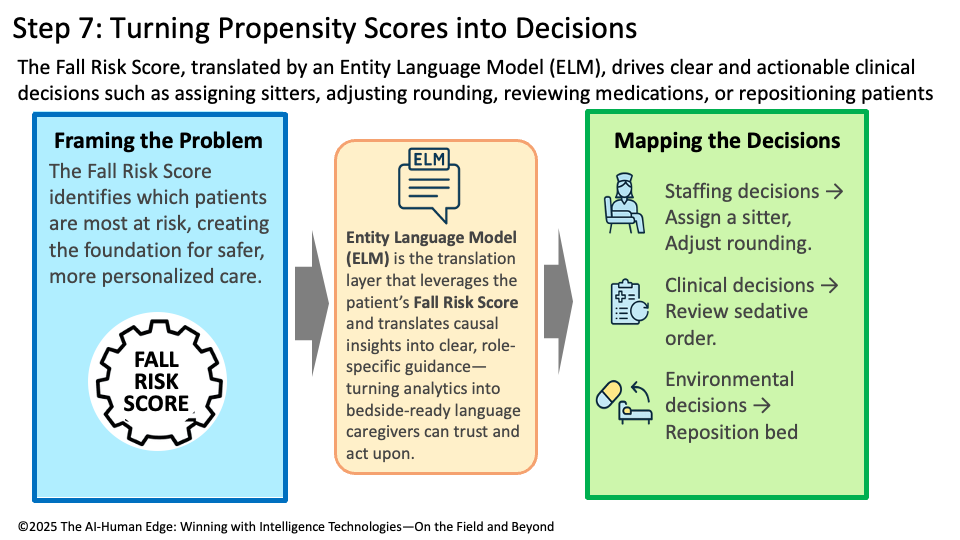 Causal AI ensures that every decision derived from the Fall Risk Score is grounded in understanding why the patient is at elevated risk and which interventions have the most significant impact. Unlike predictive-only models that flag “high risk” without explanation, causal methods surface the drivers (e.g., sedatives, nighttime staffing, mobility issues) that justify each recommendation. This is where Entity Language Models (ELMs) excel: they convert causal reasoning into natural, bedside language tailored to the audience — nurses receive clear instructions, administrators see policy-level impacts, and physicians receive clinical rationale.