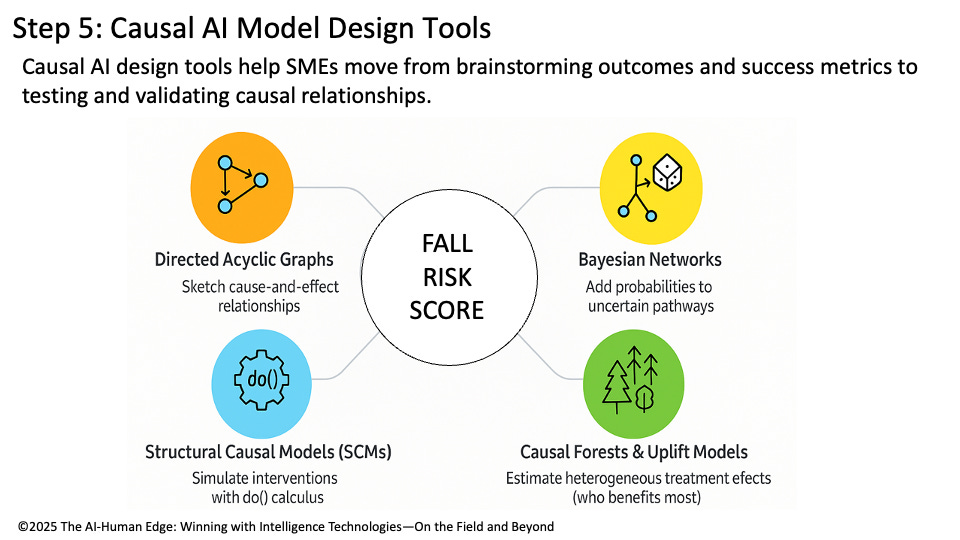 Causal AI design tools transform brainstorming into a map of relationships that shows how variables interact to achieve our desired outcomes. Directed Acyclic Graphs (DAGs), Bayesian Networks, Structural Causal Models (SCMs), and Causal Forests transform SME input into structured, testable hypotheses that provide the foundation for building, testing, and refining our Fall Risk Score.